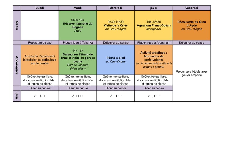 Il faut noter que les activités se déroulent presque toutes à l’extérieur. En cas de mauvais temps, nous nous replions sur les espaces couverts, mais cela impacte nécessairement le séjour.
